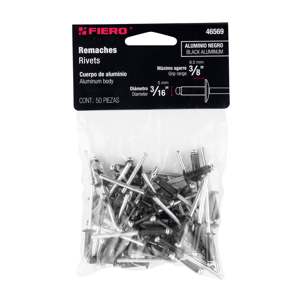 Bolsa con 50 remaches 3/16"x3/8" negros de aluminio, ala 3/8"
