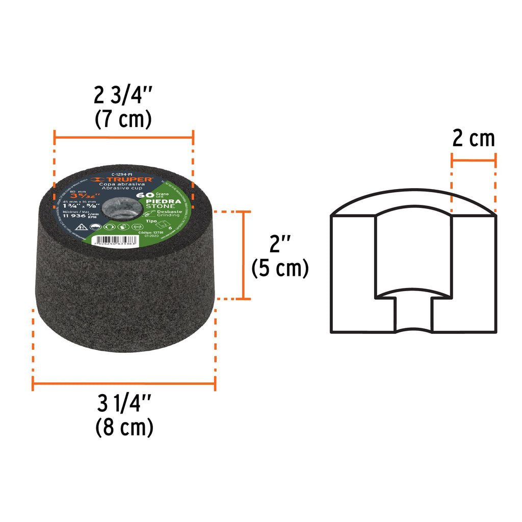 Copa desbaste de piedra 3-5/32" grano 60, eje 5/8-11, Truper