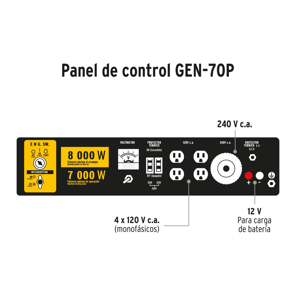 • Motor OHV a 4 tiempos de alto desempeño, no requiere mezcla de aceite y gasolina. • Controles: Sensor de nivel bajo de aceite, MAP Sensor y protección de sobrecarga. • Fácil almacenamiento y transporte y con mangos abatibles y ruedas (GEN-70P y GEN-55P)