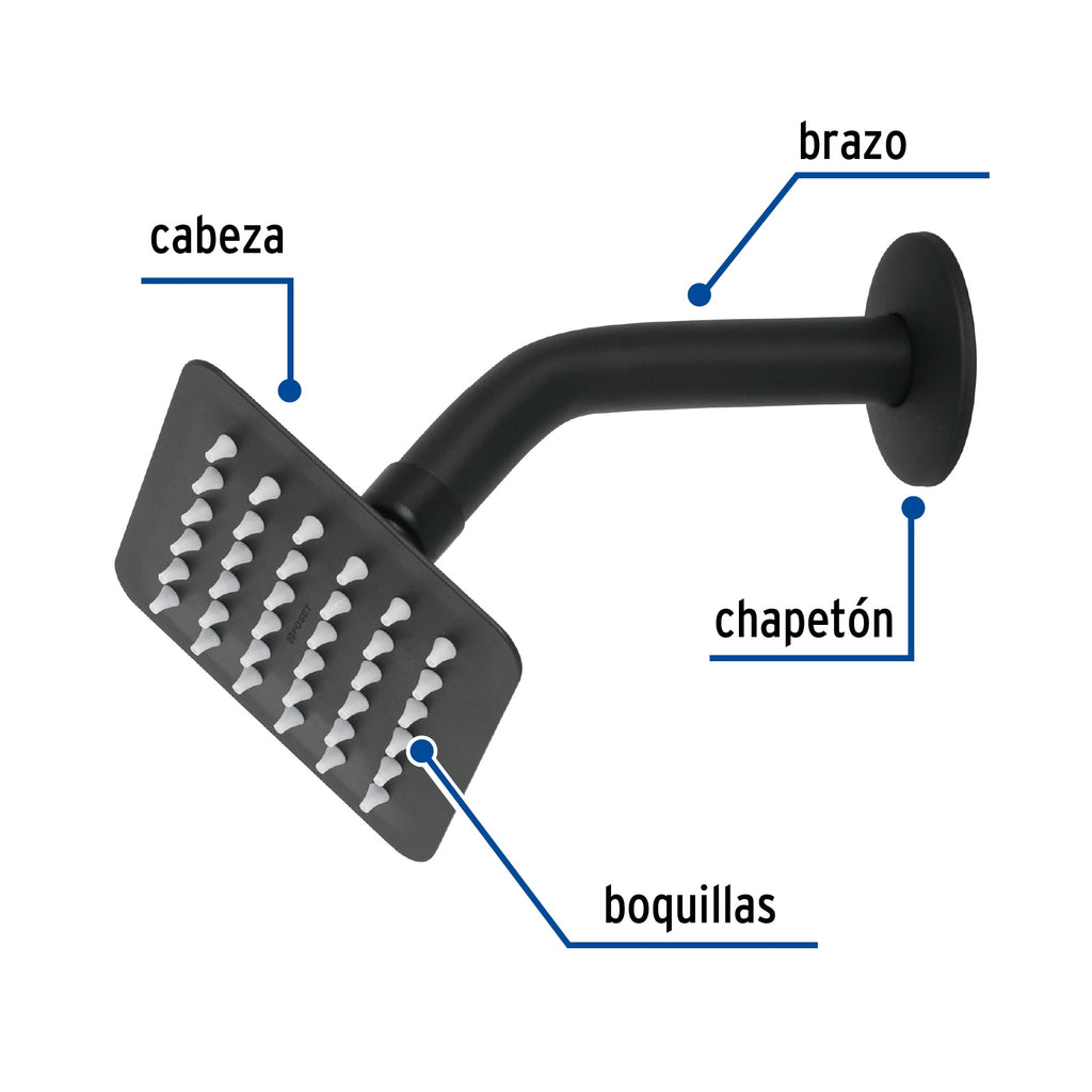 Regadera cuadrada 4", acero inox, con brazo, negro, Túbig